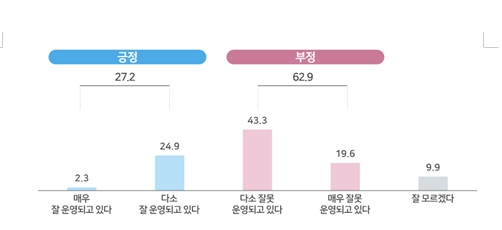 또한 현재 형사사법 서비스에 대한 국민의 평가는 부정의견이 62.9%로 긍정의견 27.2%보다 크게 앞섰다.