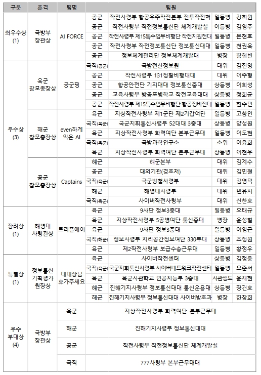 또한, 우수 참가자들을 배출한 △ 육군 지상작전사령부 화력여단 본부근무대 △ 해군 진해기지사령부 정보통신대대 △ 공군 작전사령부 작전정보통신단 체계개발실 △ 국직기관 777사령부 본부근무대대가 우수부대상 (국방부 장관상)을 수상했다.