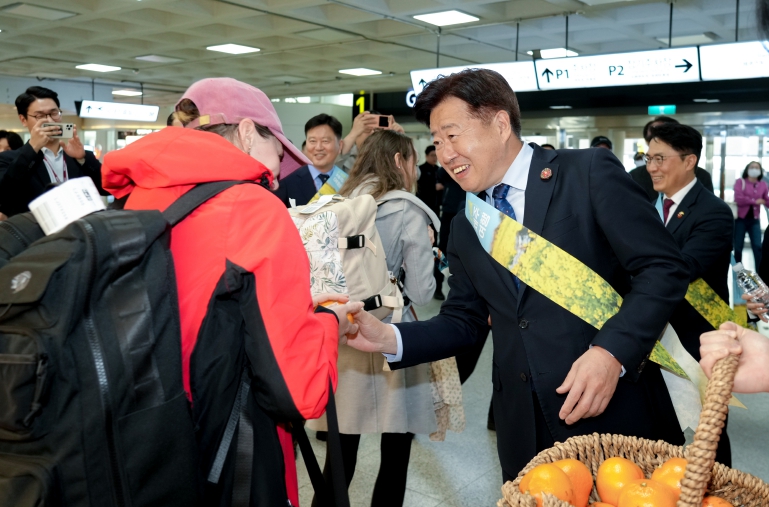 이와 함께 제주에 도착하는 관광객들에게 제주 삼다수와 제주감귤을 나눠주는 정겨운 환대행사도 이어졌다.
