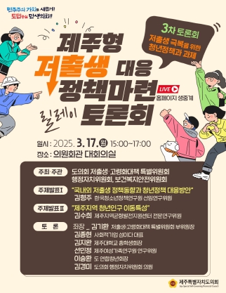 주제발표 이후 토론에는 김종현 사회적기업 섬이다 대표, 김지완 제주대학교 총학생회장, 선민정 제주여성가족연구원 연구위원, 이승환 도 연합청년회장, 김경미 제주도의회 의원이 참석해 저출생 문제 해결을 위한 제주지역 청년정책을 점검하고, 개선과제에 대한 각계각층의 목소리를 전한다.