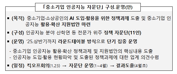 정책자문단에서는 지난해 12월 통과된 AI 기본법상 중소기업 관련 규제 및 대응방안, 정부 중점 지원과제, 해외 인공지능 우수정책 벤치마킹, 학습 데이터 확보·공유 등 다양한 논의를 통해 중소기업 인공지능 활용·확산을 위한 정책과제와 법안 마련을 위한 과제도 제안할 예정이다.