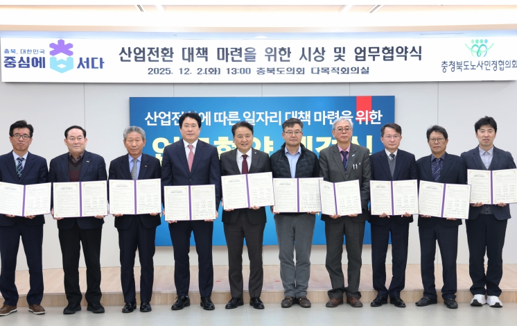 [뉴스서울] 충청북도노사민정협의회(위원장 김영환)는 2일 충청북도의회 다목적회의실에서 산업전환 업무협약 및 시상식·토론회를 개최하고, 산업구조 변화에 따른 고용불안에 선제적 대응을 위한 노·사·민·정 상생협력 체계를 강화했다.