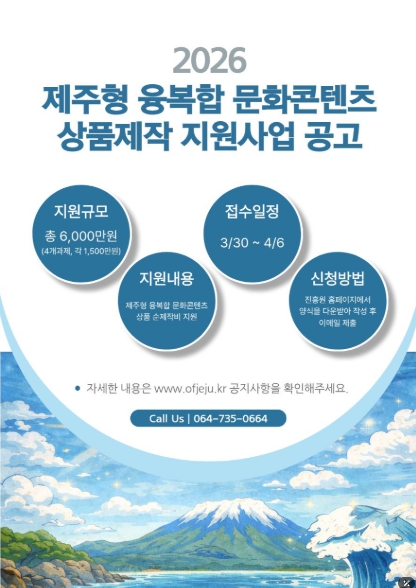 [뉴스서울] 제주특별자치도와 (재)제주콘텐츠진흥원(원장:강민부)은 콘텐츠 IP 경쟁력을 기반으로 한 지속 가능한 상품화 모델 구축을 위해 2026 제주형 융복합 문화콘텐츠 상품제작 지원사업을 시행한다.