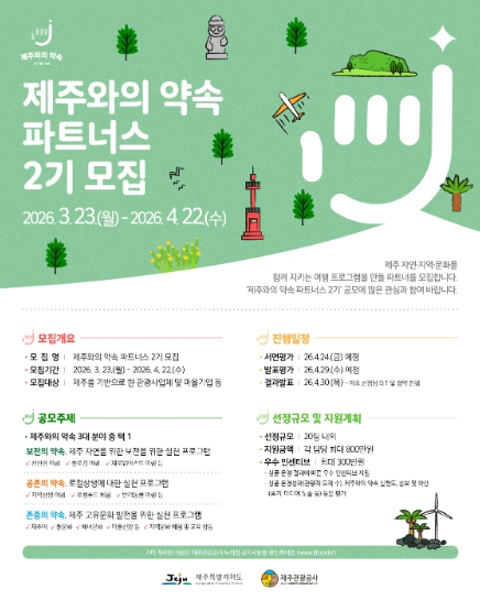 [뉴스서울] 제주특별자치도와 제주관관공사(사장 고승철)는 오는 4월 22일까지 온라인 채널을 통해 지속 가능한 제주관광을 위한 실천프로젝트 지원사업인 ‘제주와의 약속 파트너스 2기’ 공모를 추진하고 있다고 24일 밝혔다.