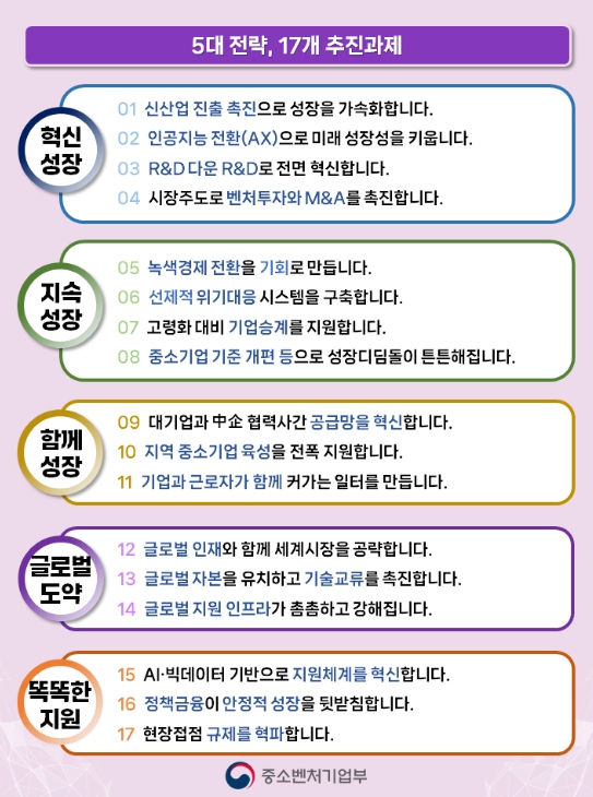 [뉴스서울] 중소벤처기업부는 중소기업의 새로운 도약을 위한 전략을 발표했다. 이번 발표는 중소기업의 ‘혁신 성장’, ‘지속 성장’, ‘함께 성장’, ‘세계적(글로벌) 도약’, ‘똑똑한 지원’을 5대 전략으로 하여 중장기 중소기업 정책 방향을 담았다.