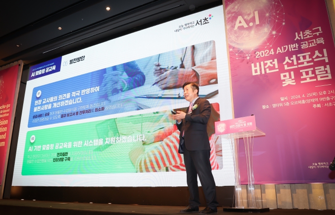 ▲ 전성수 서초구청장이 25일 엘타워에서 열린 ‘2024 서초구 AI 기반 공교육 비전 선포식 및 포럼’에서 서초구의 AI 기반 맞춤형 공교육 비전에 대해 발표하고 있다. |