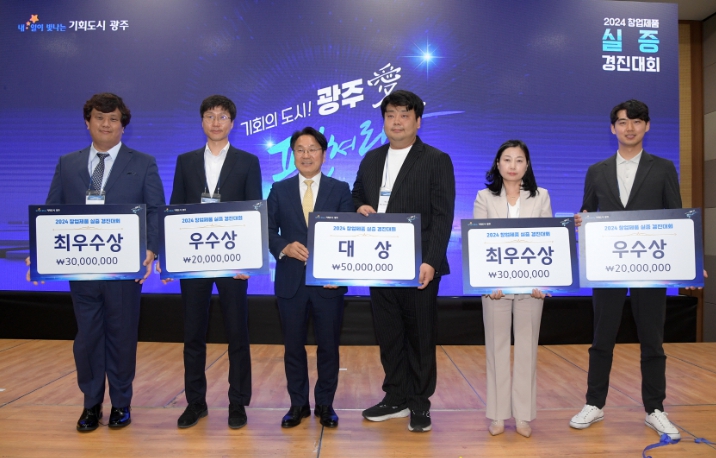 | ▲ 강기정 광주광역시장이 14일 오후 김대중컨벤션센터 컨퍼런스홀에서 열린 ‘2024 창업기업제품 실증 경진대회’에 참석해 우수 기업에게 시상한 후 수상자들과 함께 기념촬영을 하고 있다. /광주광역시 제공 |