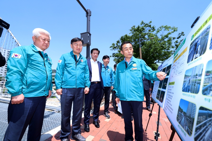 이어, 토목분야와 전기분야 민간 전문가가 사전 점검한 결과에 대한 설명을 들은 후, 다리 난간 등 안전시설과 다리 쉼터 조명 전기장치 등을 직접 확인했다.