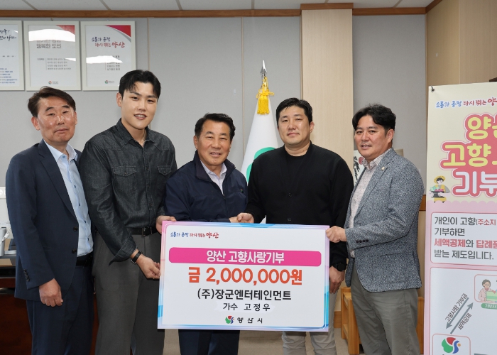 [뉴스서울] 양산시는 ㈜장군엔터테인먼트 소속 가수 고정우가 양산시에 고향사랑기부금 200만원을 기탁했다고 14일 밝혔다.