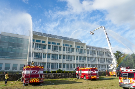 현장훈련은 제일요양원에서 원인미상 화재 발생을 시작으로 전기차 화재와 건축물 붕괴 등 복합 재난 상황을 가정해 진행됐다. 소방대원들은 인명구조와 화재진압, 시설물 복구 등 실전에 대비한 훈련을 실시했다.