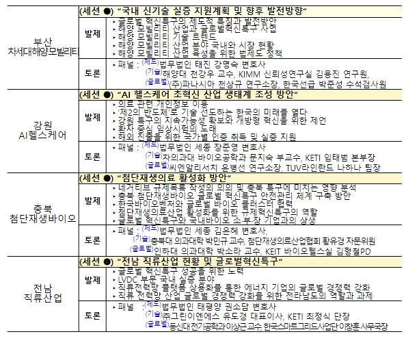 부산 차세대 해양 이동수단(모빌리티) 분야(세션)에서는 국제적(글로벌) 혁신특구의 제도적 특징과 발전방안, 강원 인공지능(AI) 건강관리(헬스케어) 분야(세션)에서는 해외진출을 위한 국가별 인증 취득 및 실증 지원, 충북 첨단재생생명(바이오) 분야(세션)에서는 최소규제(네거티브 규제)목록 작성의 의의 및 특구에 미치는 영향 분석, 전남 직류산업 분야(세션)에서는 직류전력망 온라인거래터(플랫폼) 상용화를 통한 에너지 기업의 세계(글로벌) 경쟁력 강화 등을 주제로 토론이 진행됐다.