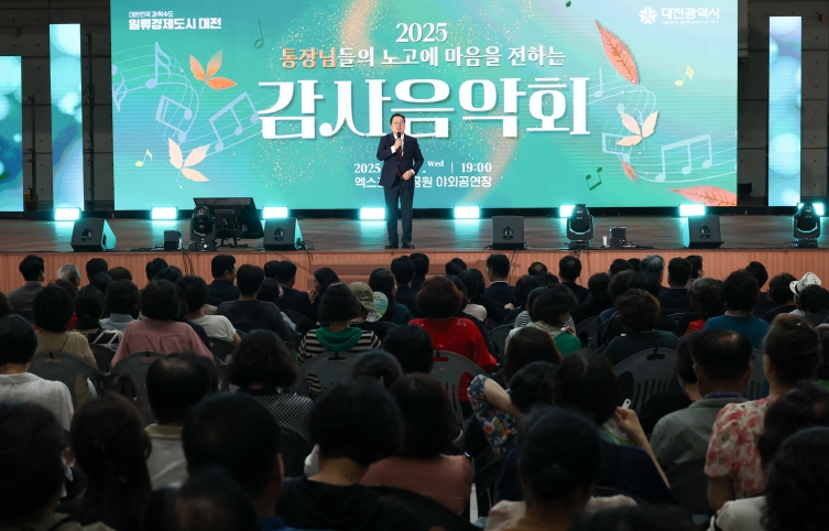 [뉴스서울] 대전시는 9월 17일 오후 7시 엑스포시민광장 야외공연장에서 5개 구 2,600여 명의 통장들을 초청해 감사음악회를 개최했다. 이번 행사는 주민등록 사실조사, 복지 사각지대 발굴, 대전 0시 축제, 봉사활동 등 지역 곳곳에서 묵묵히 헌신해 온 통장들에게 감사의 마음을 전하기 위해 마련됐다.