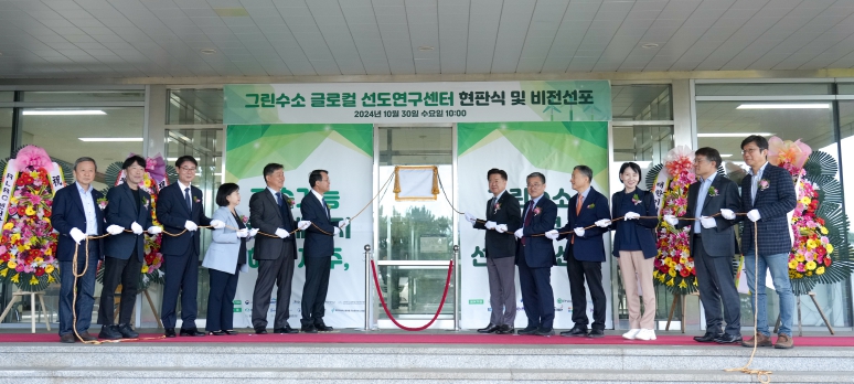 이날 현판식에는 오영훈 지사, 김일환 제주대학교 총장, 황판식 과학기술정보통신부 연구개발정책실장, 박노철 한국연구재단 공학단장, 김상재 그린수소 글로컬 선도연구센터 센터장을 비롯한 유관기관, 참여기업 등 100여 명이 참석했다.