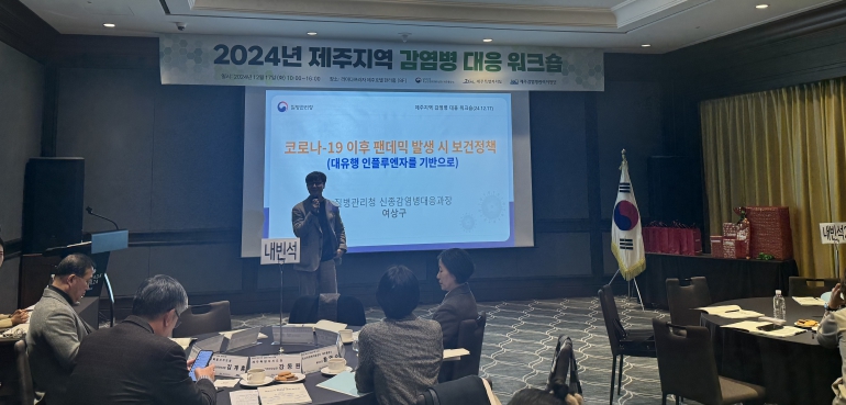 질병관리청 신종감염병대응과 여상구 과장이 팬데믹 발생 시 보건정책에 대해 발표했으며, 질병청 제주출장소는 2025년 신규사업을 제시했다.