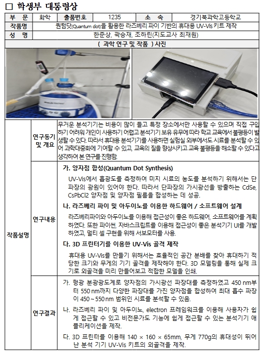 영예의 학생부 대통령상은 「퀀텀 닷(Quantum dot)을 활용한 라즈베리 파이 기반의 휴대용 자외선-가시광선(UV-Vis) 도구모음 제작」 작품을 출품한 경기북과학고등학교 2학년 한준상, 곽승재, 조하린 학생의 ‘퀀텀닷스타즈‘팀에게, 교원‧일반부 대통령상은 「이매패류 패각의 특징에 따른 서식 환경 분석 및 인공지능 교육용 소프트웨어(코스웨어) 연계 실험장치 개발」 작품을 출품한 상암초등학교 최두형, 웅천초등학교 이지윤 교사의 ‘상상이룸‘팀에게 수여됐으며,