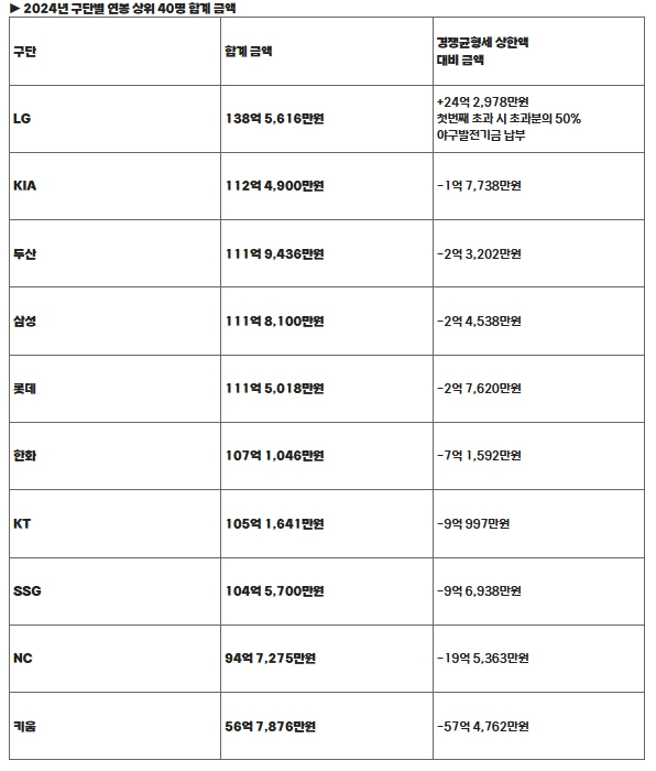 금액 집계 결과LG는 상위 40명의 합계 금액이 138억 5,616만원으로 경쟁균형세 상한액 대비 24억 2,978만원이 초과돼, 해당 액수의 50%인 12억 1,489만원을 야구발전기금으로 납부한다.