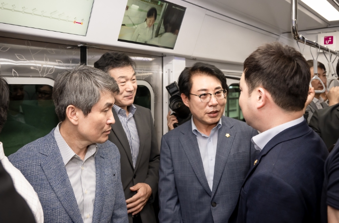 ▲ 남양주시의회 조성대 의장(좌측에서 세 번째)이 별내선 개통행사 기념식을 마치고 열차를 시승하고 있다. |