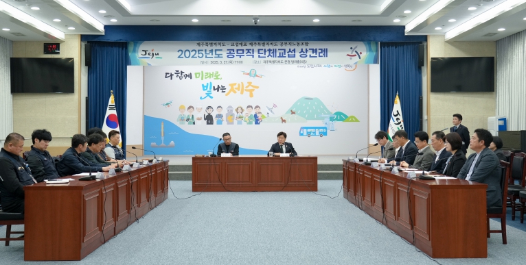 제주도와 교섭대표 노동조합인 제주도공무직노동조합은 27일 오전 10시 50분 도청 탐라홀에서 2025년 공무직 단체교섭을 위한 상견례를 개최했다.