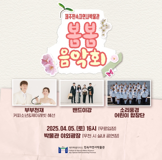 [뉴스서울] 제주특별자치도 민속자연사박물관은 4월 5일 오후 4시 박물관 야외 정원에서 ‘봄봄 음악회’를 개최한다.