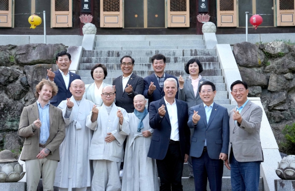 ▲ 김영록 전라남도지사가 19일 오후 장성 백양사에서 사찰음식과 문화자원을 세계에 알리기 열린 정관스님과 함께하는 ‘미국 유명 쉐프 에릭 리퍼트’ 초청 공양행사에서 김한종 장성군수, 정관스님과 에릭 리퍼트 등 참석자들과 기념촬영을 하고 있다. |