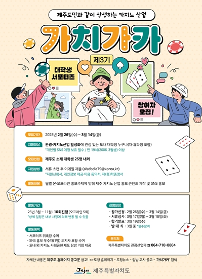 [뉴스서울] 제주특별자치도는 카지노산업 홍보 서포터즈 ‘가치가카’ 3기 대학생 25명을 3월 14일까지 모집한다.