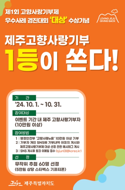 제주도는 지난 4일 제2회 고향사랑의 날에 열린 경진대회에서 기금 운영과 기부자 예우시책 등 제주만의 차별화된 기부제 운영으로 호평을 받았다. 이를 기념하고 감사의 뜻을 전하고자 ‘1등이 쏜다!’ 이벤트를 마련했다.