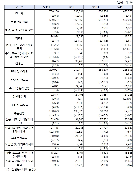 2024년 상반기 창업은 돌봄 ․ 간병, 교육 등 관련 수요가 확대되고 있는 업종을 중심으로 증가했으나, 글로벌 경기둔화 여파 등으로 전체적으로는 전년대비 4.3%(27,744개) 감소한 62만 2,760개로 집계됐다.