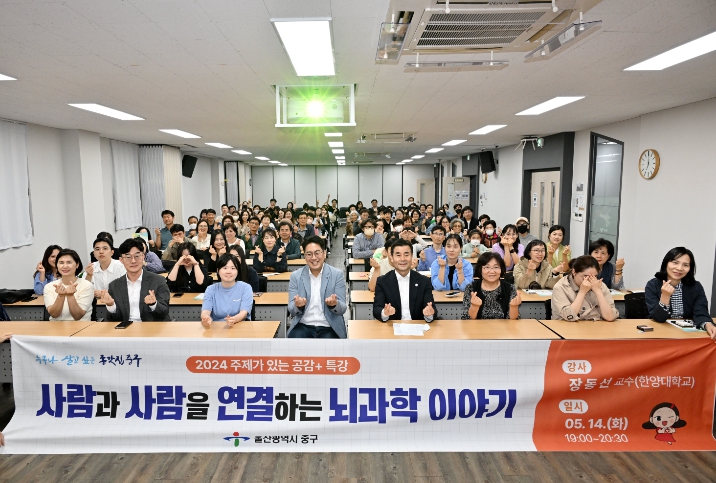 | ▲ 2024 주제가 있는 공감 +특강이 14일 중구 평생학습관에서 김영길 중구청장과 구민들이 참석한 가운데 장동선 교수의 사람과 사람을 연결하는 뇌과학 이야기를 주제로 열렸다. |