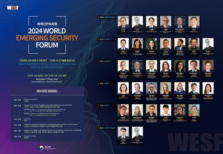 조태열 외교부 장관을 비롯하여 칼 빌트(Carl Bildt) 유럽외교협회(ECFR) 공동의장 및 전 스웨덴 총리, 댄 스미스(Dan Smith) 스톡홀름국제평화연구소(SIPRI) 소장, 이광형 KAIST 총장, 제임스 앤드류 루이스(James Andrew Lewis) 미 전략국제문제연구소(CSIS) 수석부회장, 그리고 임종인 대통령실 사이버 특보 등 30여명의 국내 및 해외 연사들이 포럼에 참여하여, 급속한 기술 발전으로 인해 오늘날의 안보 문제가 국경과 분야를 뛰어넘어 영향을 미치면서 변화하고 있는 국제안보 현안 및 대응 방안에 대해 논의할 예정이다.