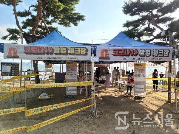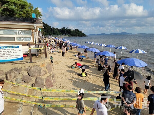 해수욕장 입구 방역 요원의 안내에 따라 발열체크와 수기명부 작성 또는 안심콜 출입관리 서비스를 거친 뒤에야 안으로 들어갈 수 있었다.