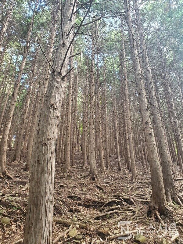 사진은 지난 10월 10일 오전 필자가 촬영한 무등산 꼬막재 인근 편백나무 숲의 모습이다.