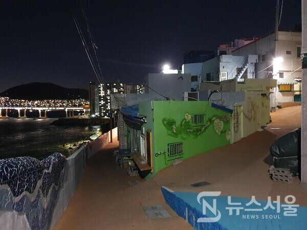 필자는 약 20여분 정도 ‘흰여울문화마을’을 관통하면서 구경한 후 남항방파제로 내려가기 위해 ‘절영해안산책로’로 내려갔다. 저녁 7시 30분경 영도 남항방파제길에 접어 들었는데 약간 어둑한 시간에 가로등이 연이어 노란 빛을 뿜어내고 있어서 방파제길을 걸으면서 어둑한 영도바다와 건너편 암남동과 남부민동을 연결하는 남항대교에서 발산하고 있는 도시의 불빛이 섞인 이국적인 분위기를 느끼면서 봄밤 저녁의 한가로운 트레킹을 만끽하였다.