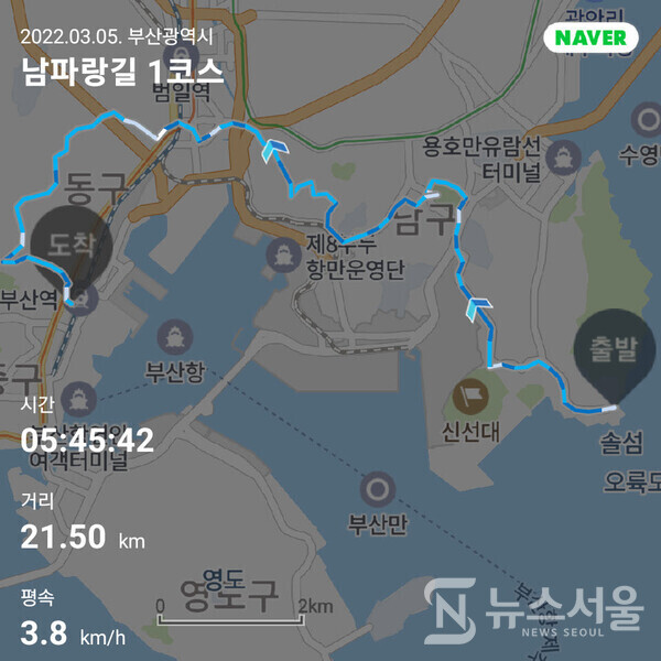 필자는 지난 3월 첫째 주 토요일 부산역에서 남파랑길 1코스 트레킹을 마치고 부산역 인근 식당에서 늦은 점심식사를 한 뒤, 오후 4시 33분경 본격적으로 남파랑길 2코스 트레킹을 시작하였다.