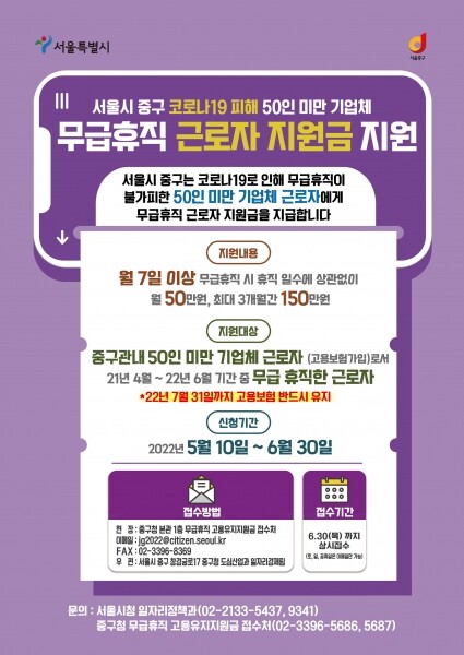 지원 대상은 2021년 4월 1일 이후 월 7일 이상 무급 휴직한 중구 관내 50인 미만 기업체 근로자로 고용보험에 가입되어 있어야 한다.