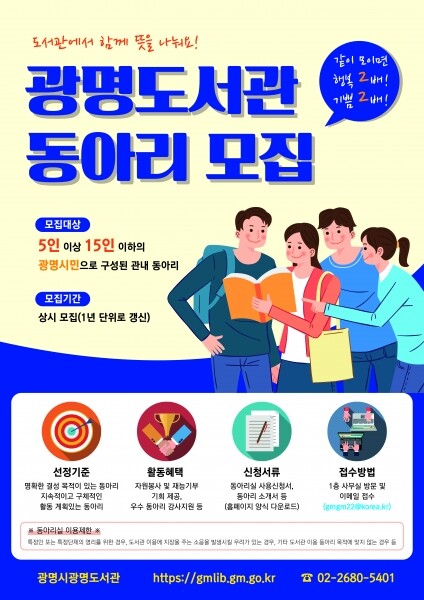 광명도서관 동아리 모집은 5인 이상 15인 미만의 광명시민으로 구성된 동아리라면 누구나 신청할 수 있다.