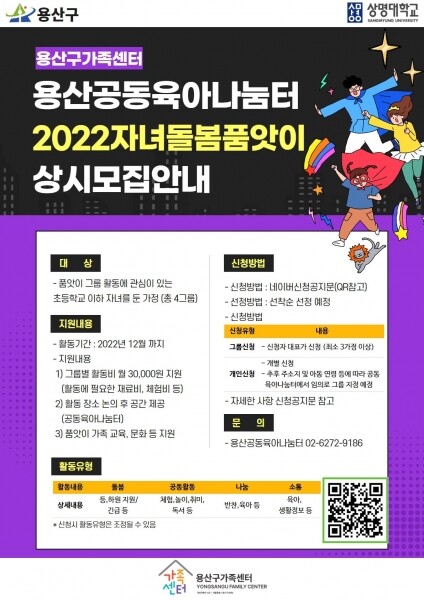 신청은 2022 자녀돌봄 품앗이 상시 신청 안내문 내 QR코드를 참고하면 된다.