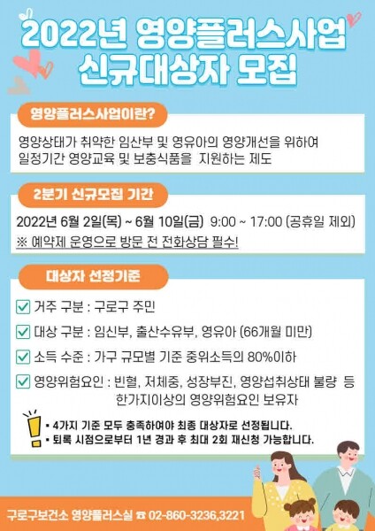 신청을 원하는 이는 전화 상담 후 주민등록등본, 건강보험증, 최근 6개월분 건강보험료 납입증명서 등 제출 서류를 갖춰 다음달 2일부터 10일 오후 5시까지 구로구보건소 5층 영양플러스실을 방문하면 된다.