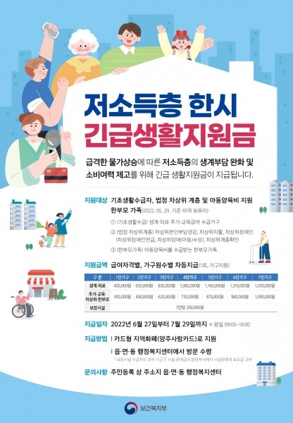 시 관계자는 “코로나19로 인한 급격한 물가상승으로 어려운 시기를 겪는 저소득층에게 한시 긴급생활지원금이 조금이나마 도움이 되길 바란다”며 “지원금이 신속하게 대상자에게 지급될 수 있도록 최선을 다할 계획”이라고 밝혔다.