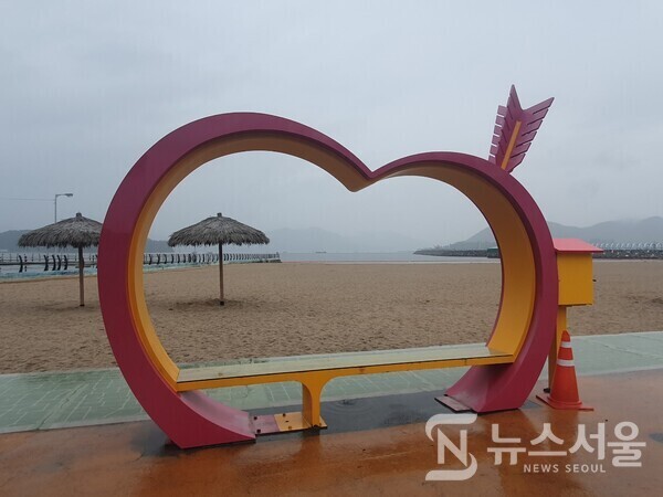 사진은 지난 6월 5일 오후 필자가 비 오는날 촬영한 광암해수욕장 하트모양 벤치와 백사장의 모습이다.