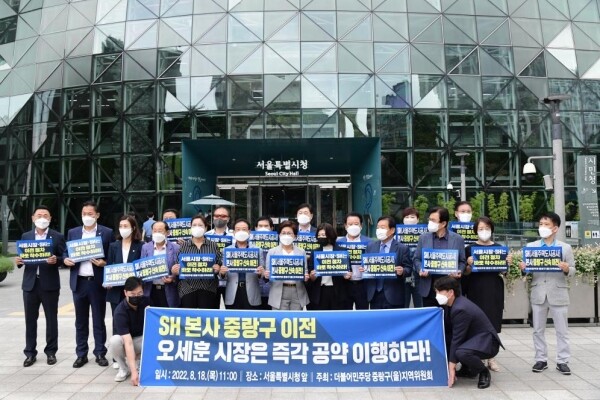 이날 기자회견에는 박승진 의원, 전석기 전 서울시의원을 비롯한 21명의 더불어민주당 중랑지역위원회가 함께했으며 이들은 지난 2020년 9월 서울시·중랑구·SH공사 3자가 체결한 ‘서울주택도시공사 중랑구 이전을 위한 협약’에 따라 공사 이전을 위한 절차를 조속히 마무리해줄 것을 서울시에 강력히 요청했다.