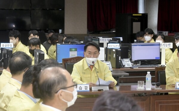 [뉴스서울] 이성헌 서대문구청장이 22일 오전 구청 3층 종합상황실에서 열린 을지연습 개시 보고회에서 “복합적 전쟁 양상을 고려한 다양한 상황 조치에 최선을 다해 달라”고 당부하고 있다.