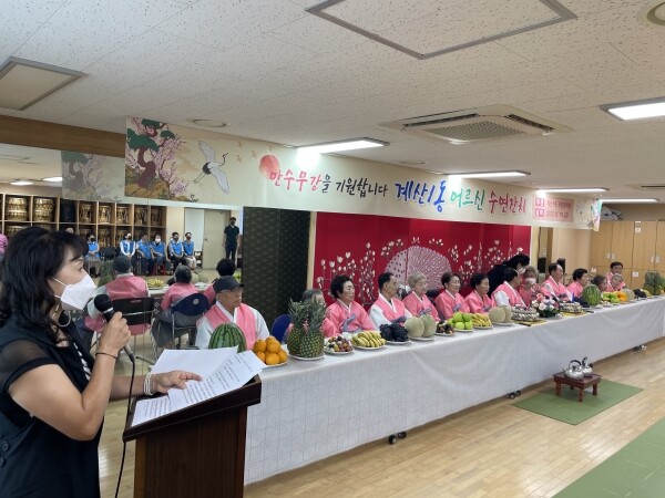 이날 잔치는 올해 팔순을 맞은 관내 홀몸 어르신 15명을 모시고 계산1동 행정복지센터에서 상차림, 헌수, 축수 등을 올리며 경로효친사상을 고취하고 어르신들의 만수무강을 기원하는 행사로 진행됐다.