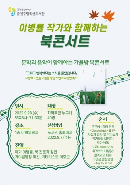 오진이 금천문화재단 대표는 “많은 사랑을 받고 있는 이병률 작가와 함께하는 북콘서트에서 작가의 삶과 작품, 따뜻한 감동을 전할 예정이다”며 “가을밤, 독산도서관에서 문학과 음악을 마음껏 즐기며 힐링하는 시간이 되길 바란다”고 전했다.