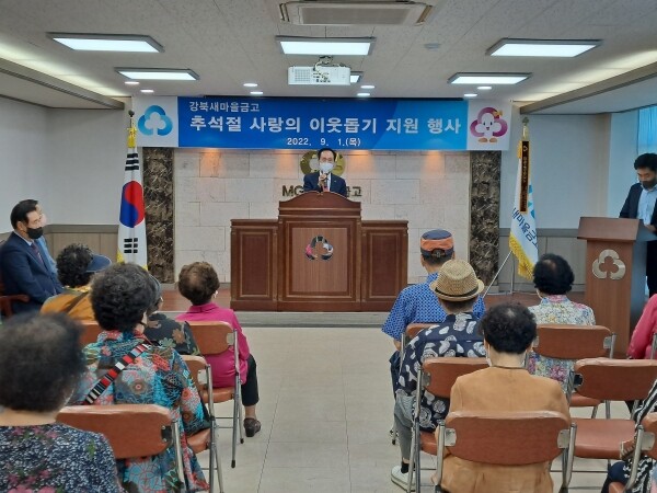 강북새마을금고는 매년 설과 추석 명절을 맞이해 지역 내 공적복지제도가 미치지 못하는 소외된 어려운 이웃을 찾아 나눔 행사를 꾸준히 개최하고 있으며 지역사회 공헌활동을 꾸준히 실천해 주민과 상생하는 기업의 본보기가 되고 있다.