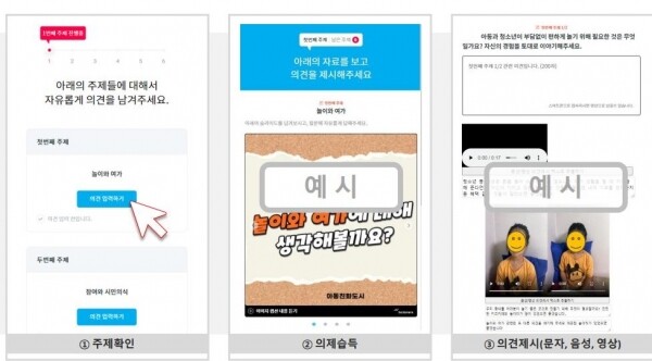 의견수렴은 놀이와 여가 참여와 시민의식 안전과 보호 보건과 사회서비스 교육환경 주거환경 등 아동들의 일상생활과 밀접한 6개 영역을 주제로 온라인 설문 형식으로 진행된다.