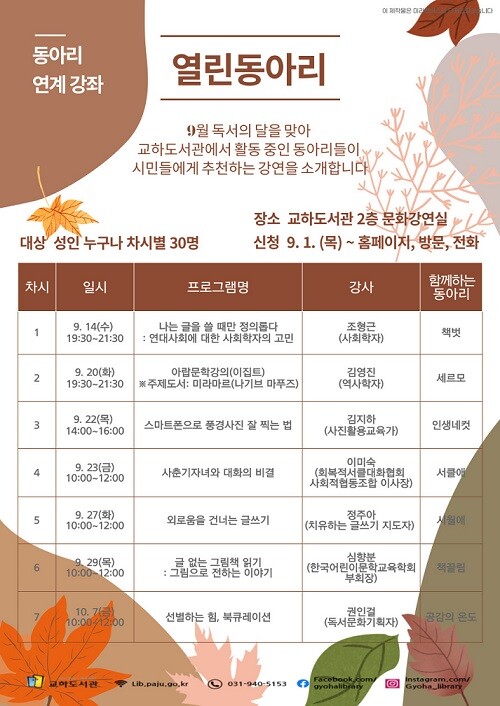 자세한 사항은 교하도서관 홈페이지에서 확인해 볼 수 있으며 9.1부터 홈페이지, 전화, 방문을 통해 접수를 받고 있다.