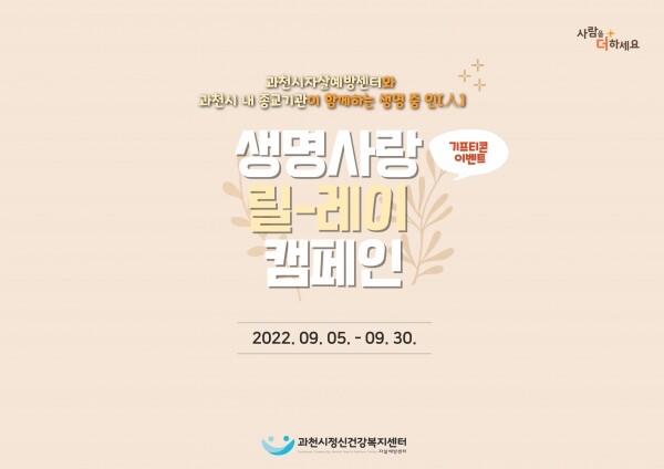 캠페인은 과천시정신건강복지센터 홈페이지를 통해 온라인 정신건강 자가검진, 생명사랑 퀴즈 이벤트, 따뜻한 응원의 쪽지 쓰기 등으로 진행된다.