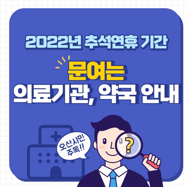 추석 연휴기간 중 이용 가능한 의료기관과 약국 정보는 오산시 및 오산시보건소 홈페이지, 응급의료포털, 응급의료정보제공 어플, 보건복지부 콜센터, 경기도 콜센터, 119구급상황관리센터 등을 통해 확인할 수 있다.