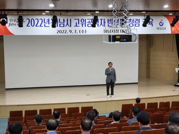 하남시는 7일 시청 대강당에서 이현재 시장을 비롯한 5급 이상 고위 공직자 60여명을 대상으로 ‘하남시 고위공직자 반부패·청렴 교육’을 실시하고 청렴 의지를 다졌다.