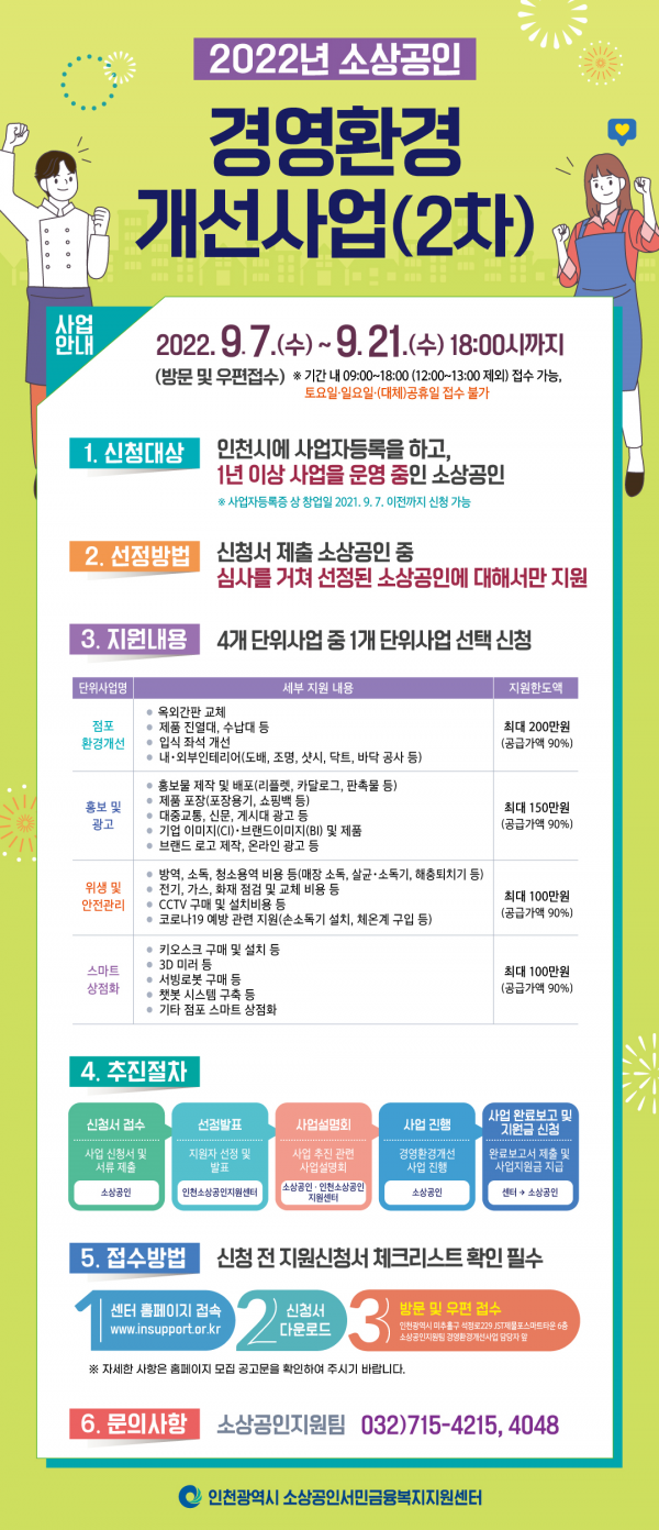 2차 사업의 신청자 모집은 이달 7일부터 21일까지로 창업한 지 1년이 넘은 관내 소상공인이면 인천광역시 소상공인 서민금융복지지원센터에 방문 또는 등기 우편을 통해 접수할 수 있다.